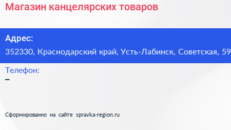 Магазин канцелярских товаров по адресу 352330, Краснодарский край, Усть-Лабинск, Советская, 59 в дальнейшем Организация, размещена в следующих категориях:
