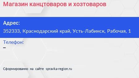 Магазин канцтоваров и хозтоваров по адресу 352333, Краснодарский край, Усть-Лабинск, Рабочая, 1 в дальнейшем Организация, размещена в следующих категориях:
