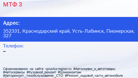 МТФ-3 по адресу 352331, Краснодарский край, Усть-Лабинск, Пионерская, 327 в дальнейшем Организация, размещена в следующих категориях:
