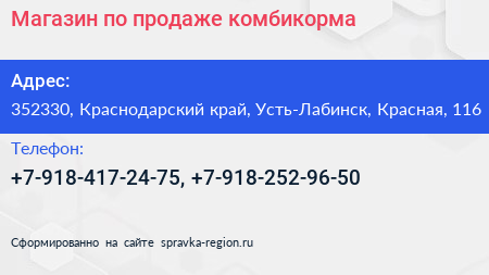 Магазин по продаже комбикорма по адресу 352330, Краснодарский край, Усть-Лабинск, Красная, 116 в дальнейшем Организация, размещена в следующих категориях: