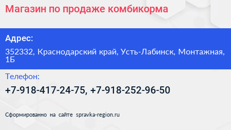 Магазин по продаже комбикорма по адресу 352332, Краснодарский край, Усть-Лабинск, Монтажная, 1Б в дальнейшем Организация, размещена в следующих категориях: