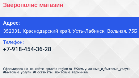 Зверополис, магазин по адресу 352331, Краснодарский край, Усть-Лабинск, Вольная, 75Б в дальнейшем Организация, размещена в следующих категориях: