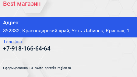 Best, магазин по адресу 352332, Краснодарский край, Усть-Лабинск, Красная, 1 в дальнейшем Организация, размещена в следующих категориях: