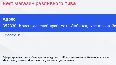 Best, магазин разливного пива по адресу 352330, Краснодарский край, Усть-Лабинск, Клепикова, 3а в дальнейшем Организация, размещена в следующих категориях:
