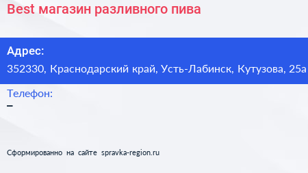 Best, магазин разливного пива по адресу 352330, Краснодарский край, Усть-Лабинск, Кутузова, 25а в дальнейшем Организация, размещена в следующих категориях: