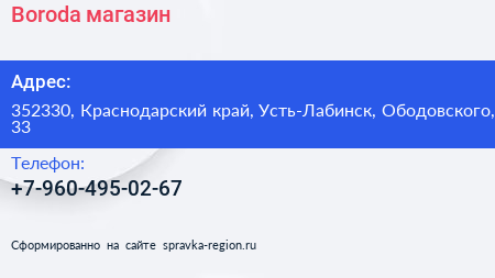 Boroda, магазин по адресу 352330, Краснодарский край, Усть-Лабинск, Ободовского, 33 в дальнейшем Организация, размещена в следующих категориях: