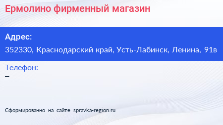 Ермолино, фирменный магазин по адресу 352330, Краснодарский край, Усть-Лабинск, Ленина, 91в в дальнейшем Организация, размещена в следующих категориях: