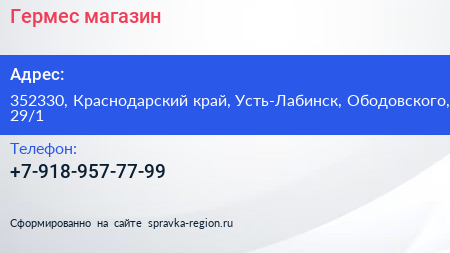 Гермес, магазин по адресу 352330, Краснодарский край, Усть-Лабинск, Ободовского, 29/1 в дальнейшем Организация, размещена в следующих категориях: