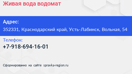 Живая вода, водомат по адресу 352331, Краснодарский край, Усть-Лабинск, Вольная, 54 в дальнейшем Организация, размещена в следующих категориях: