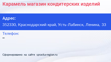 Карамель, магазин кондитерских изделий по адресу 352330, Краснодарский край, Усть-Лабинск, Ленина, 33 в дальнейшем Организация, размещена в следующих категориях: