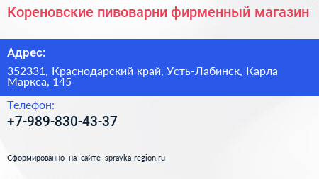 Кореновские пивоварни, фирменный магазин по адресу 352331, Краснодарский край, Усть-Лабинск, Карла Маркса, 145 в дальнейшем Организация, размещена в следующих категориях: