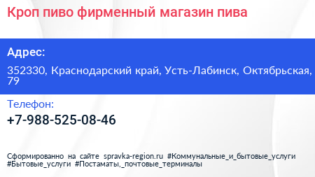 Кроп-пиво, фирменный магазин пива по адресу 352330, Краснодарский край, Усть-Лабинск, Октябрьская, 79 в дальнейшем Организация, размещена в следующих категориях: