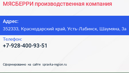 МЯСБЕРРИ, производственная компания по адресу 352333, Краснодарский край, Усть-Лабинск, Шаумяна, 3а в дальнейшем Организация, размещена в следующих категориях: