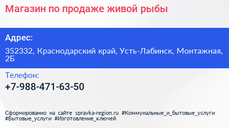 Магазин по продаже живой рыбы по адресу 352332, Краснодарский край, Усть-Лабинск, Монтажная, 2Б в дальнейшем Организация, размещена в следующих категориях: