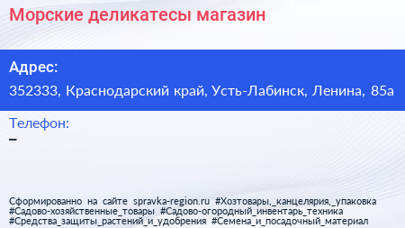 Морские деликатесы, магазин по адресу 352333, Краснодарский край, Усть-Лабинск, Ленина, 85а в дальнейшем Организация, размещена в следующих категориях: