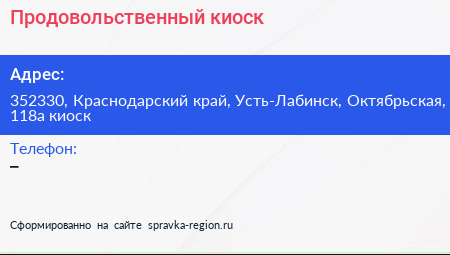 Продовольственный киоск по адресу 352330, Краснодарский край, Усть-Лабинск, Октябрьская, 118а киоск в дальнейшем Организация, размещена в следующих категориях:
