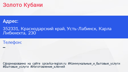 Золото Кубани по адресу 352331, Краснодарский край, Усть-Лабинск, Карла Либкнехта, 230 в дальнейшем Организация, размещена в следующих категориях: