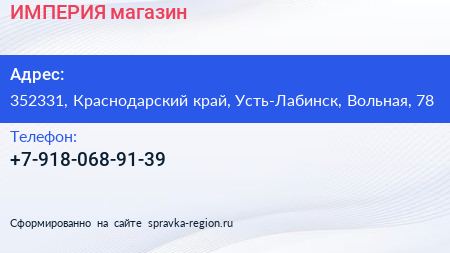ИМПЕРИЯ, магазин по адресу 352331, Краснодарский край, Усть-Лабинск, Вольная, 78 в дальнейшем Организация, размещена в следующих категориях: