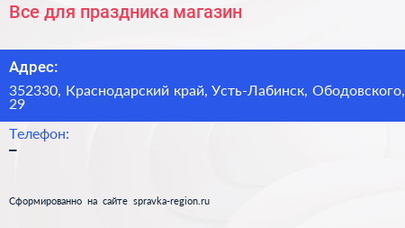 Все для праздника, магазин по адресу 352330, Краснодарский край, Усть-Лабинск, Ободовского, 29 в дальнейшем Организация, размещена в следующих категориях: