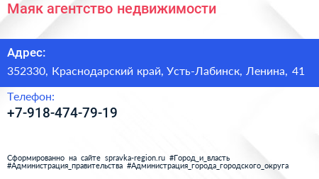 Маяк, агентство недвижимости по адресу 352330, Краснодарский край, Усть-Лабинск, Ленина, 41 в дальнейшем Организация, размещена в следующих категориях: