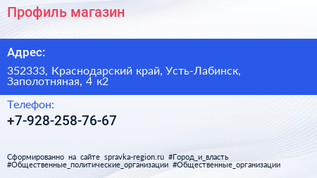 Профиль, магазин по адресу 352333, Краснодарский край, Усть-Лабинск, Заполотняная, 4 к2 в дальнейшем Организация, размещена в следующих категориях: