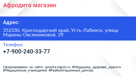 Афродита, магазин по адресу 352330, Краснодарский край, Усть-Лабинск, улица Марины Овсянниковой, 29 в дальнейшем Организация, размещена в следующих категориях: