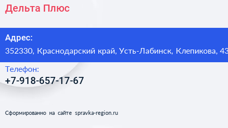 Дельта Плюс по адресу 352330, Краснодарский край, Усть-Лабинск, Клепикова, 43 в дальнейшем Организация, размещена в следующих категориях: