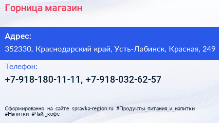 Горница, магазин по адресу 352330, Краснодарский край, Усть-Лабинск, Красная, 249 в дальнейшем Организация, размещена в следующих категориях: