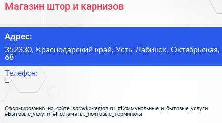 Магазин штор и карнизов по адресу 352330, Краснодарский край, Усть-Лабинск, Октябрьская, 68 в дальнейшем Организация, размещена в следующих категориях: