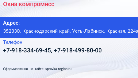 Окна компромисс по адресу 352330, Краснодарский край, Усть-Лабинск, Красная, 224а в дальнейшем Организация, размещена в следующих категориях: