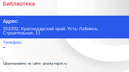 Библиотека по адресу 352332, Краснодарский край, Усть-Лабинск, Строительная, 11 в дальнейшем Организация, размещена в следующих категориях:
