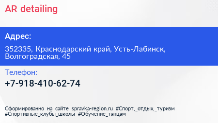 AR detailing по адресу 352335, Краснодарский край, Усть-Лабинск, Волгоградская, 45 в дальнейшем Организация, размещена в следующих категориях:
