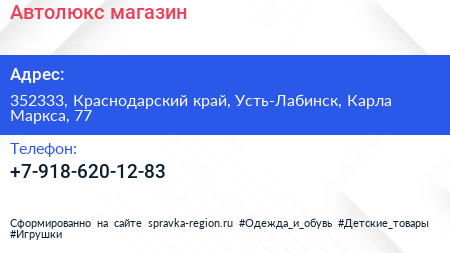 Автолюкс, магазин по адресу 352333, Краснодарский край, Усть-Лабинск, Карла Маркса, 77 в дальнейшем Организация, размещена в следующих категориях:
