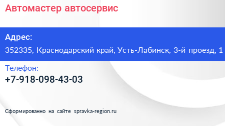 Автомастер, автосервис по адресу 352335, Краснодарский край, Усть-Лабинск, 3-й проезд, 1 в дальнейшем Организация, размещена в следующих категориях: