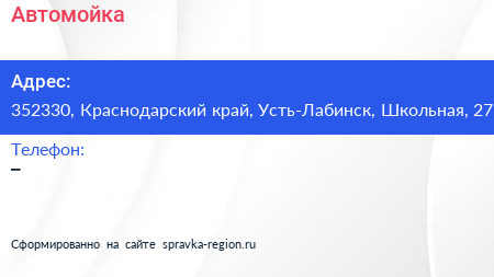 Автомойка по адресу 352330, Краснодарский край, Усть-Лабинск, Школьная, 27 в дальнейшем Организация, размещена в следующих категориях: