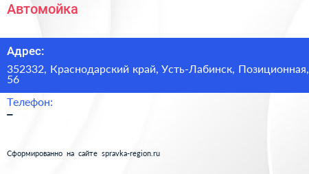 Автомойка по адресу 352332, Краснодарский край, Усть-Лабинск, Позиционная, 56 в дальнейшем Организация, размещена в следующих категориях: