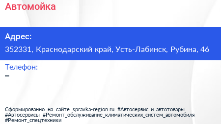 Автомойка по адресу 352331, Краснодарский край, Усть-Лабинск, Рубина, 46 в дальнейшем Организация, размещена в следующих категориях: