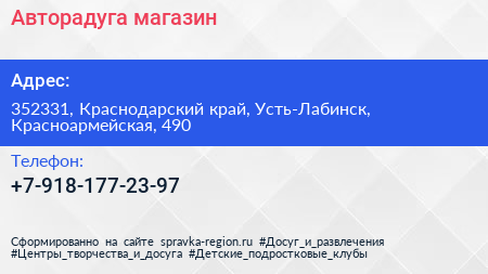 Авторадуга, магазин по адресу 352331, Краснодарский край, Усть-Лабинск, Красноармейская, 490 в дальнейшем Организация, размещена в следующих категориях: