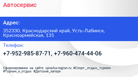 Автосервис по адресу 352330, Краснодарский край, Усть-Лабинск, Красноармейская, 135 в дальнейшем Организация, размещена в следующих категориях: