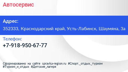 Автосервис по адресу 352333, Краснодарский край, Усть-Лабинск, Шаумяна, 3а в дальнейшем Организация, размещена в следующих категориях: