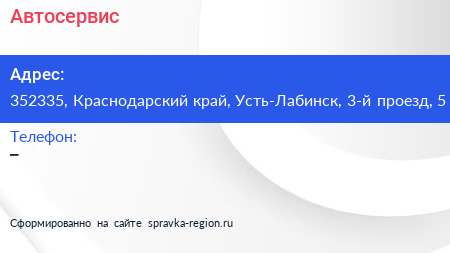 Автосервис по адресу 352335, Краснодарский край, Усть-Лабинск, 3-й проезд, 5 в дальнейшем Организация, размещена в следующих категориях: