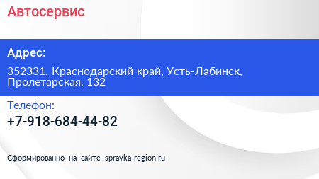 Автосервис по адресу 352331, Краснодарский край, Усть-Лабинск, Пролетарская, 132 в дальнейшем Организация, размещена в следующих категориях: