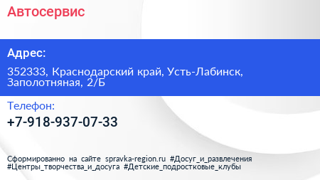 Автосервис по адресу 352333, Краснодарский край, Усть-Лабинск, Заполотняная, 2/Б в дальнейшем Организация, размещена в следующих категориях: