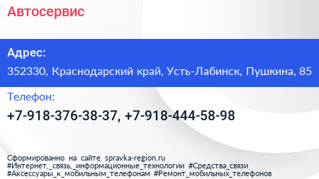 Автосервис по адресу 352330, Краснодарский край, Усть-Лабинск, Пушкина, 85 в дальнейшем Организация, размещена в следующих категориях: