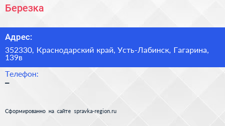 Березка по адресу 352330, Краснодарский край, Усть-Лабинск, Гагарина, 139в в дальнейшем Организация, размещена в следующих категориях: