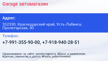 Garage, автомагазин по адресу 352330, Краснодарский край, Усть-Лабинск, Пролетарская, 30 в дальнейшем Организация, размещена в следующих категориях: