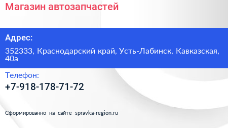 Магазин автозапчастей по адресу 352333, Краснодарский край, Усть-Лабинск, Кавказская, 40а в дальнейшем Организация, размещена в следующих категориях: