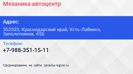 Механика, автоцентр по адресу 352333, Краснодарский край, Усть-Лабинск, Заполотняная, 41Б в дальнейшем Организация, размещена в следующих категориях: