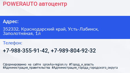POWERAUTO, автоцентр по адресу 352332, Краснодарский край, Усть-Лабинск, Заполотняная, 1л в дальнейшем Организация, размещена в следующих категориях:
