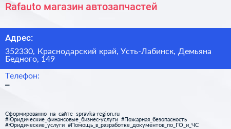 Rafauto, магазин автозапчастей по адресу 352330, Краснодарский край, Усть-Лабинск, Демьяна Бедного, 149 в дальнейшем Организация, размещена в следующих категориях: